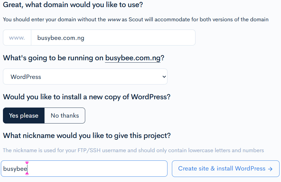 Enter a short name (lowercase letters/numbers only) — this becomes your FTP/SSH username e.g., “myshop” or “blog2024”