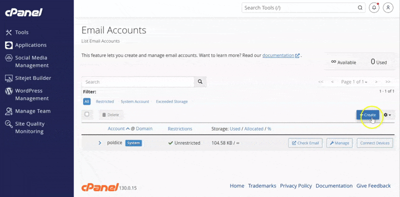 - On the Email Accounts page, click the Create button on the right-hand side.