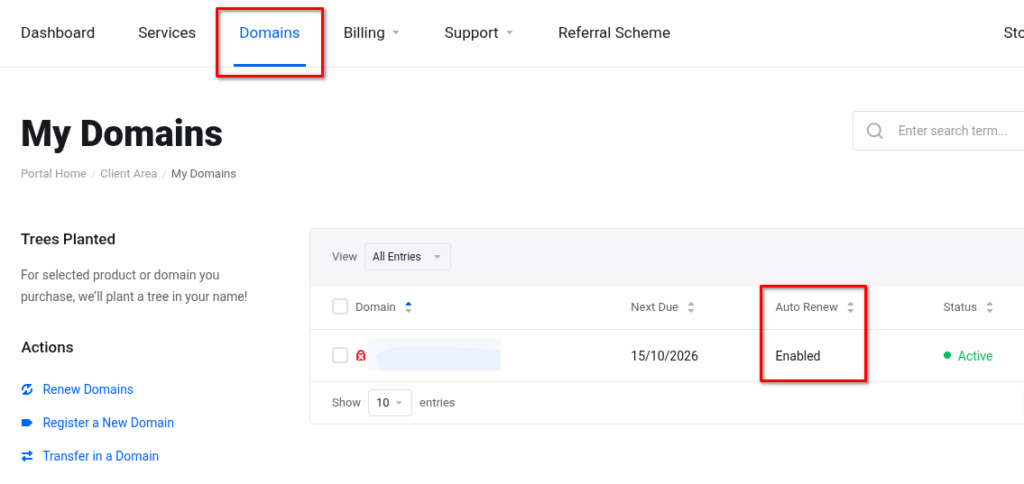 Likewise, if you want to ensure a domain renews automatically each year, it’s important auto-renewal is enabled on the domain.