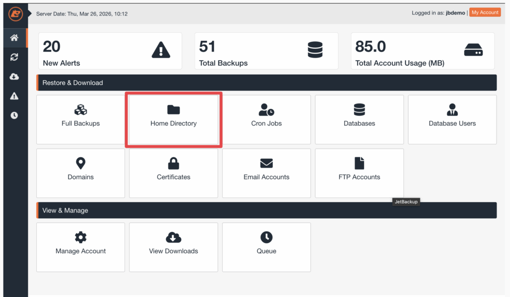 Step 1. From the JetBackup dashboard, click the Home Directory icon under “Restore & Download.”