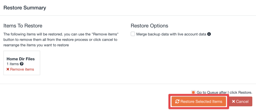 Step 5. On the confirmation screen, click Restore Selected Items.