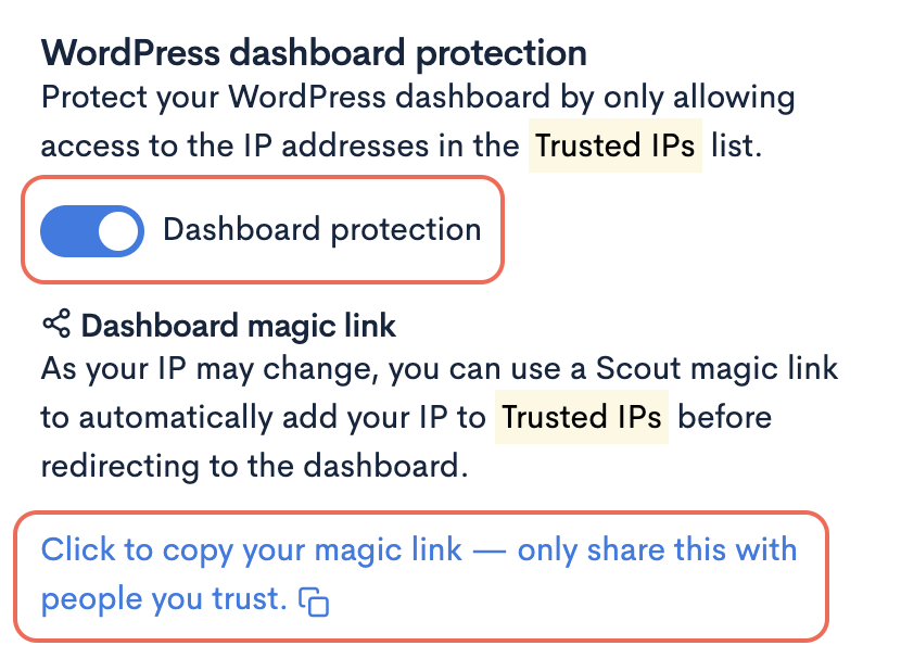 When the dashboard protection is enabled, you’ll see a Click to copy your magic link.. link and this will copy the magic link to your clipboard, allowing you to bookmark it, or share it with a colleague, or your client.